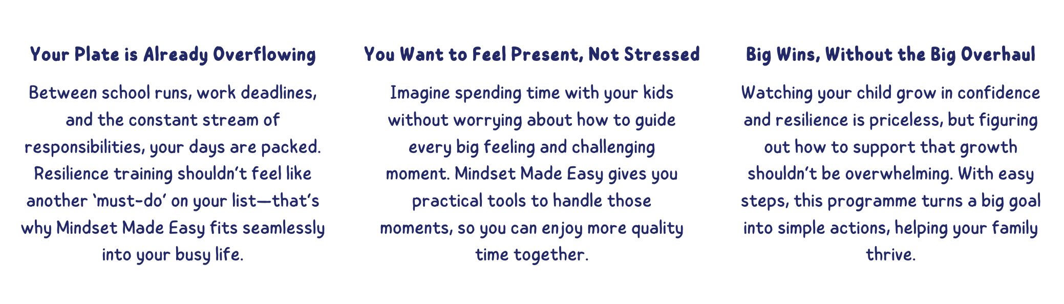 Parenting is no walk in the park. You’re busy balancing work and home, and still want to raise confident, resilient kids. Mindset Made Easy is here for you! In six fun, science-backed steps, we’ll get your family on the same page, speaking a language of resilience and confidence. Think of it as support to help your kids thrive without piling more onto your day.